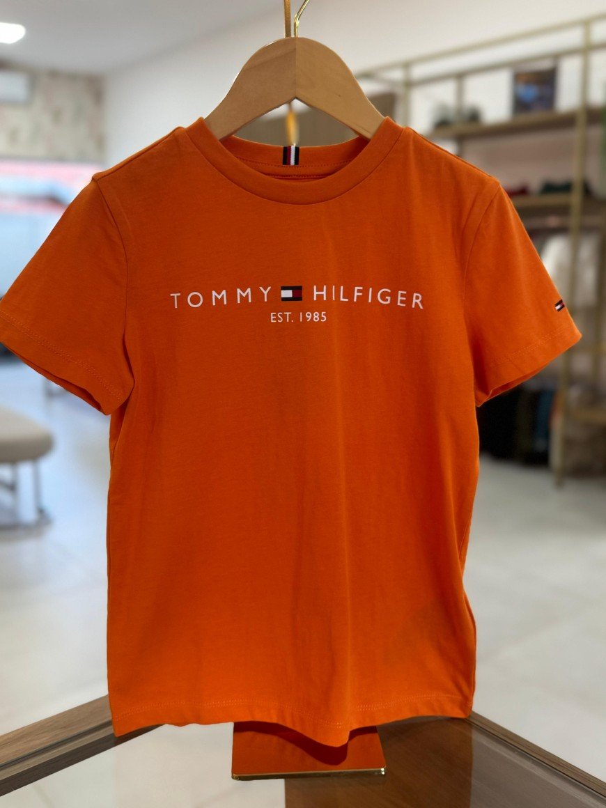 Modelo Linear Logo Tee: camiseta de manga curta na cor laranja, com estampa centralizada Tommy Hilfiger Est. 1985 e o icônico logo da marca.