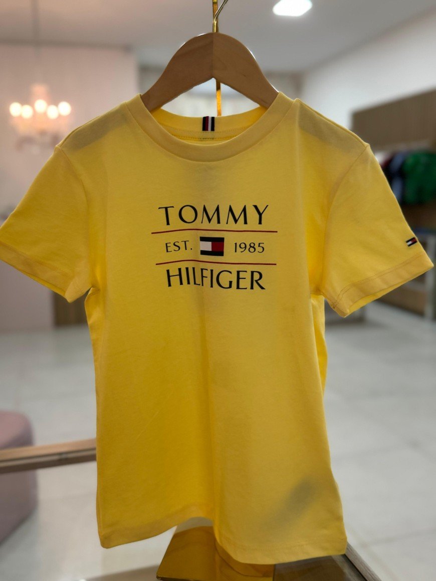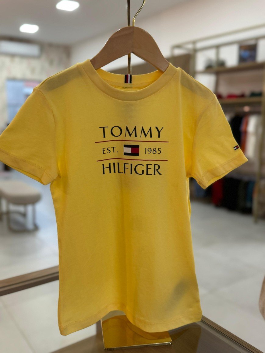 Design exclusivo: camiseta de manga curta na cor amarela, com estampa frontal Tommy Hilfiger Est. 1985 e logo icônico da marca.