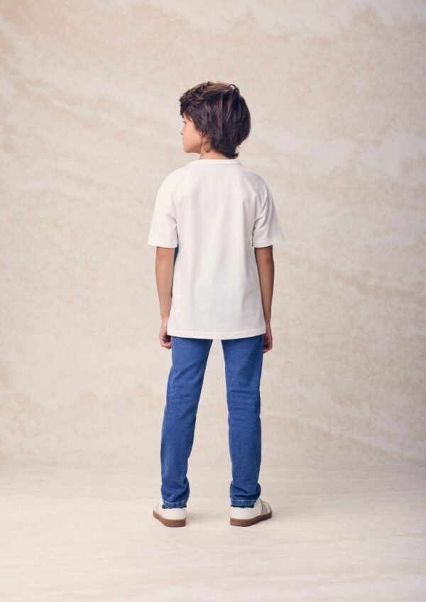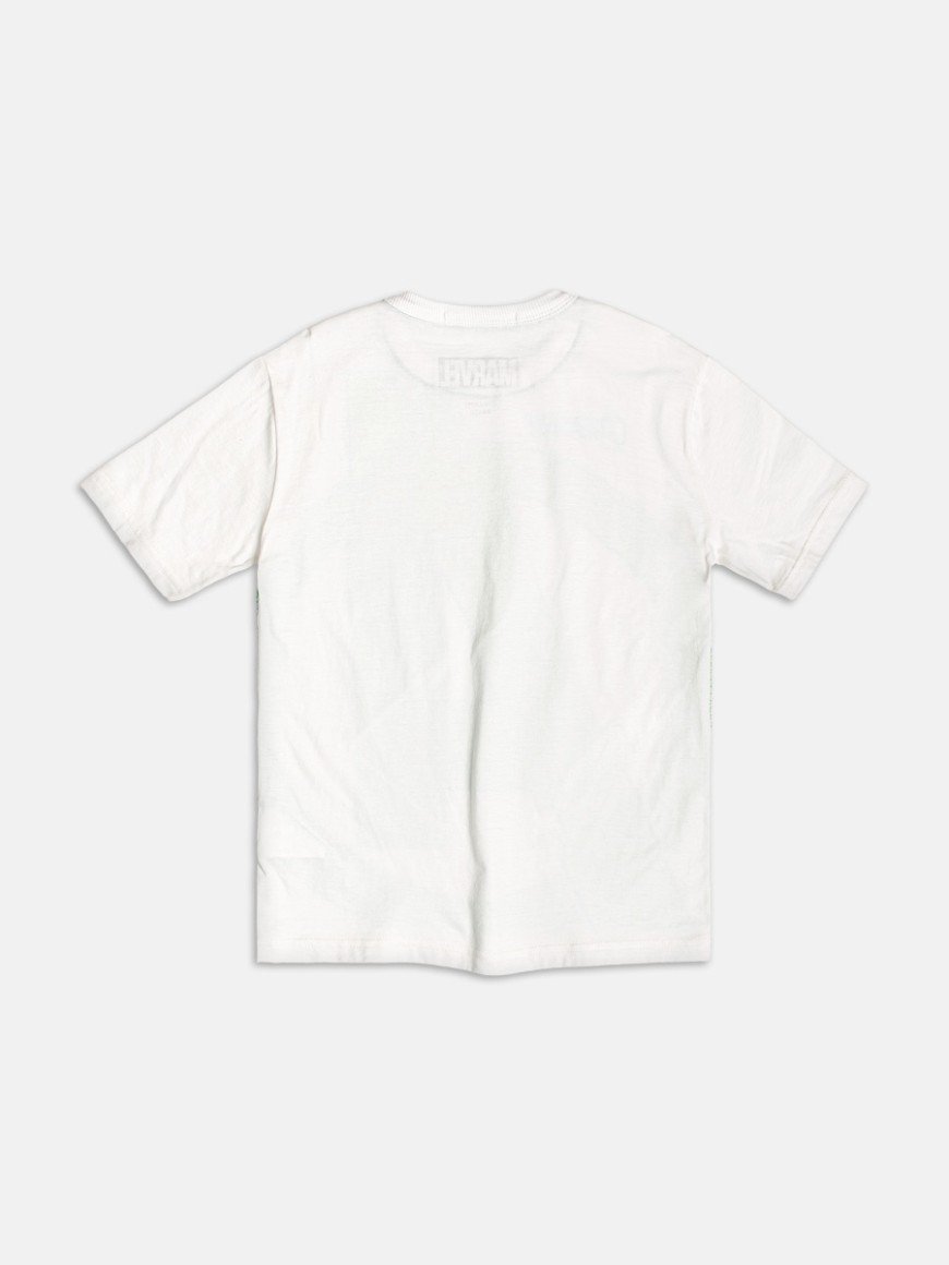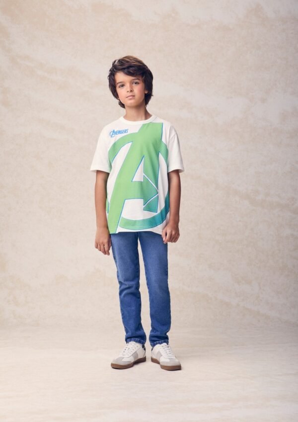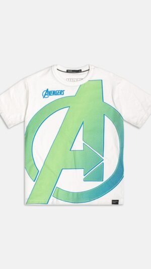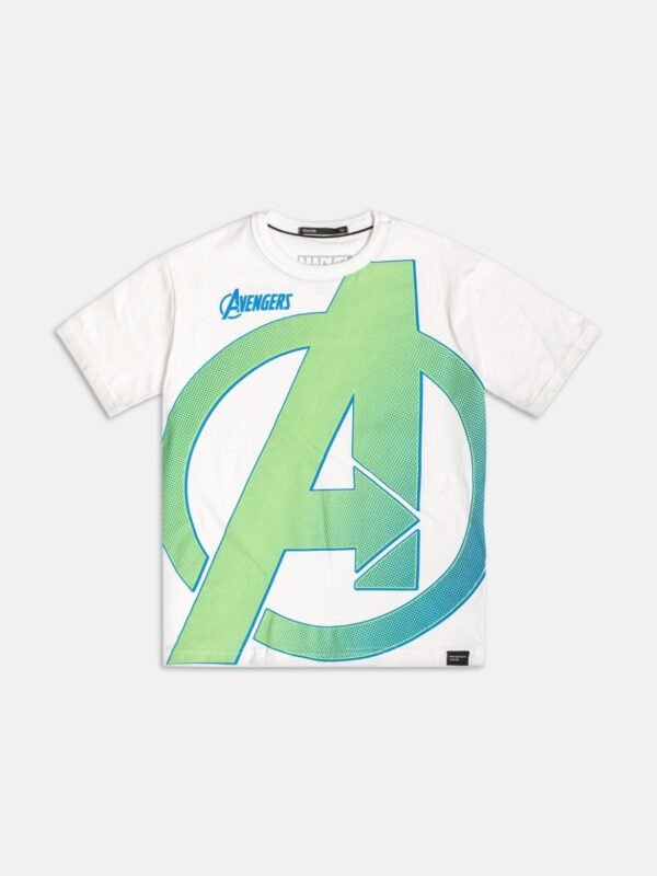 Camiseta infantil branca em algodão com estampa frontal grande dos Avengers. Produto oficial licenciado Marvel, garantindo conforto e estilo para os fãs de super-heróis.