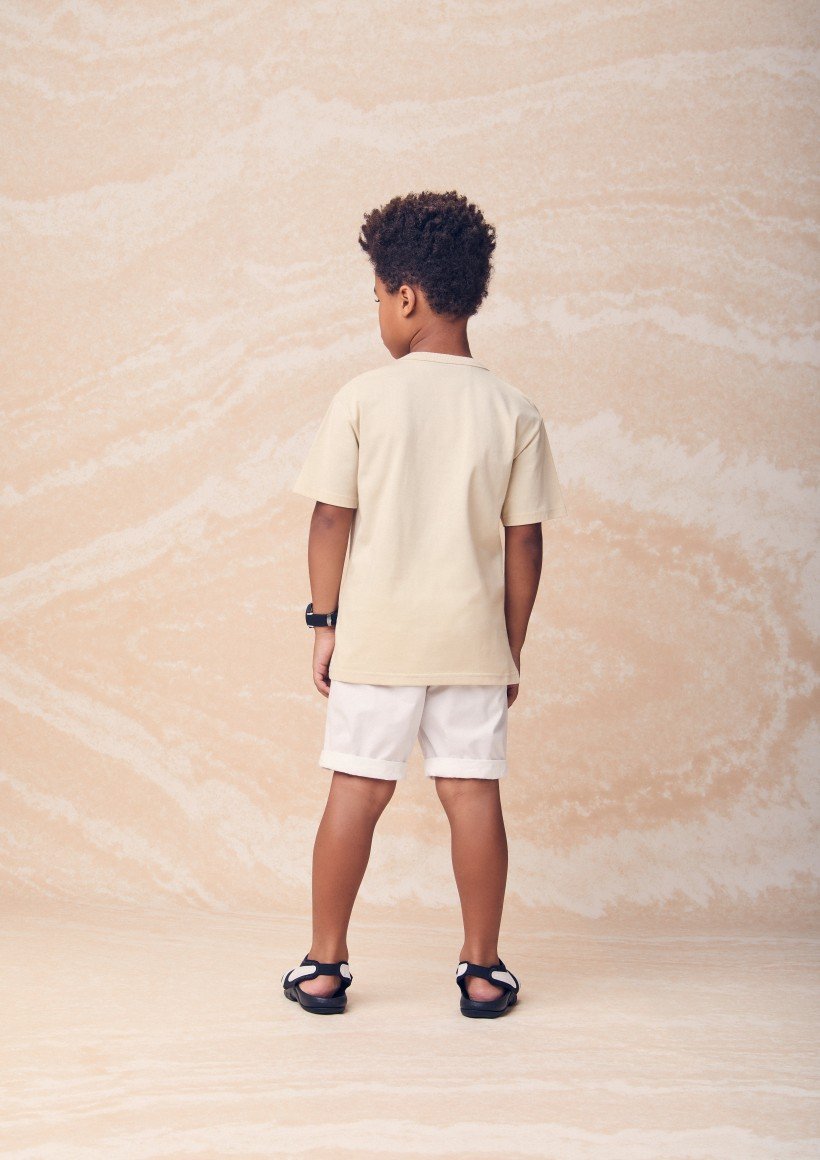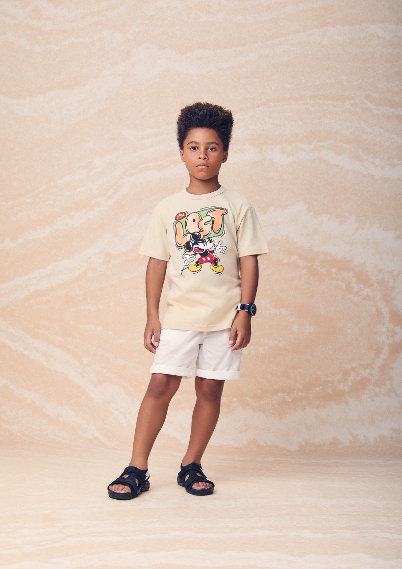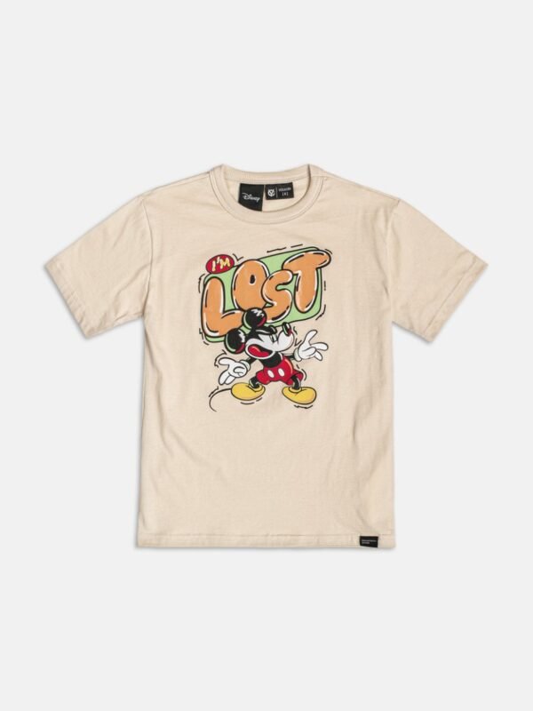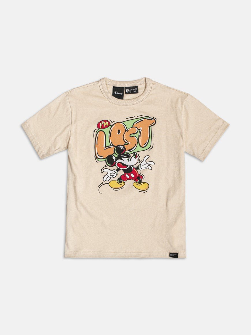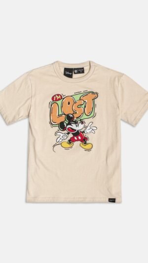 Camiseta infantil em malha leve e confortável, na cor bege, com estampa divertida do Mickey e a frase ‘Im Lost’.