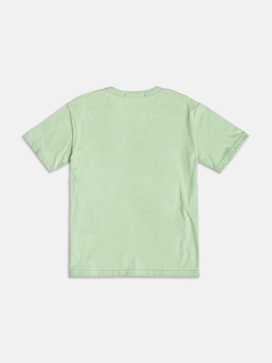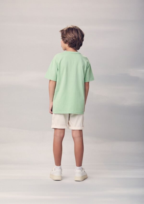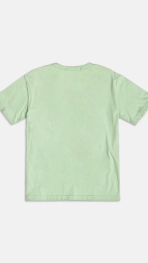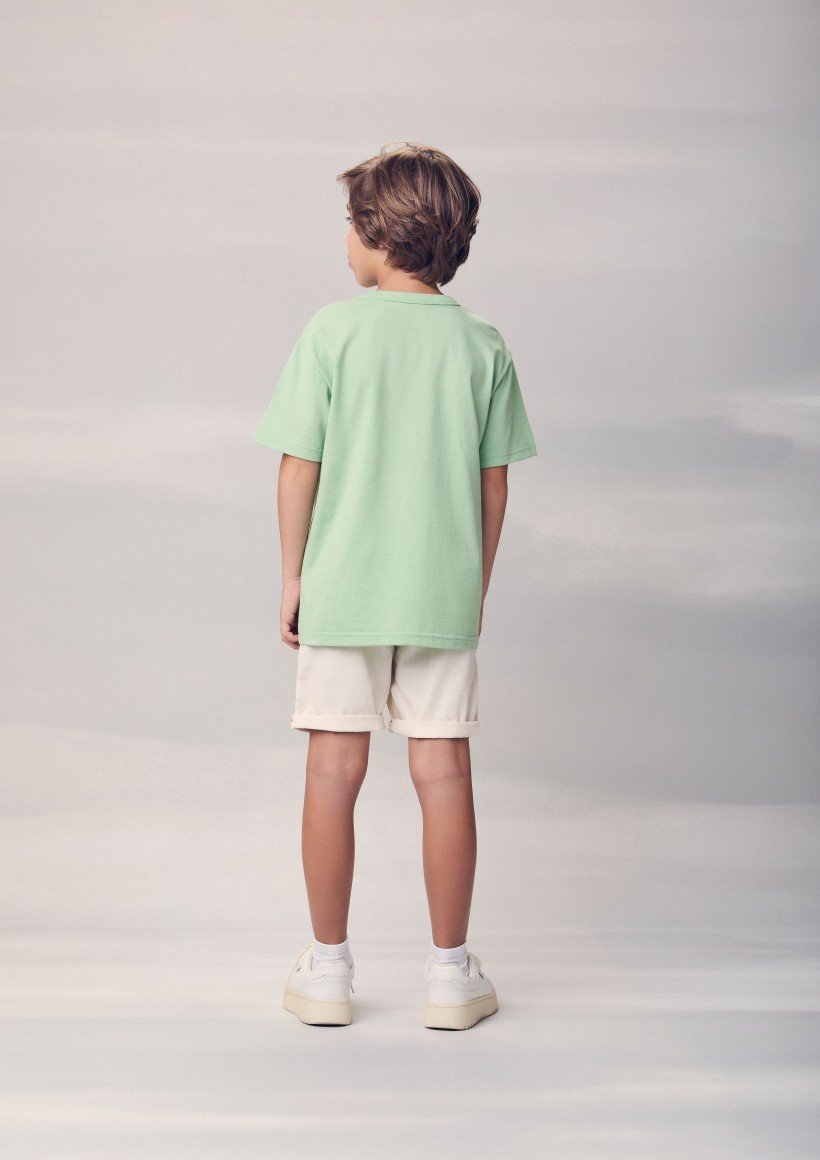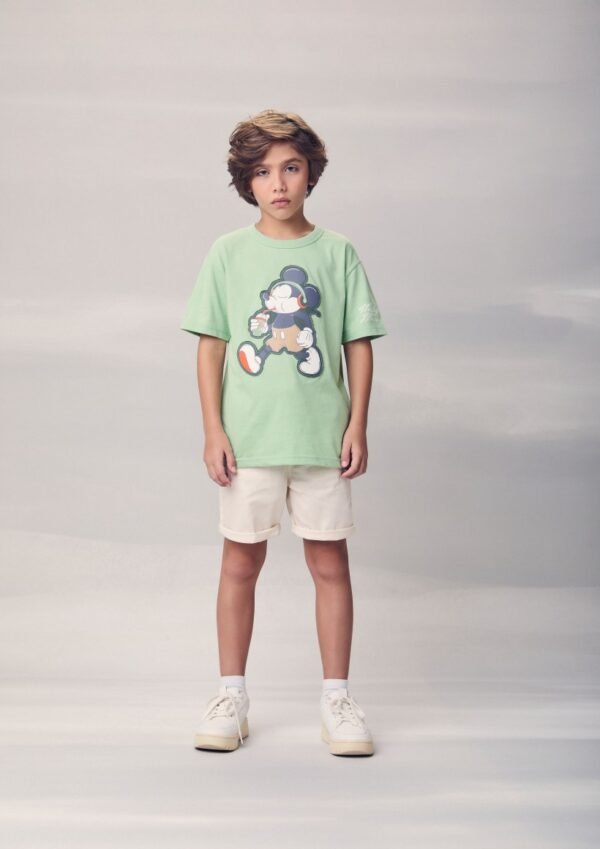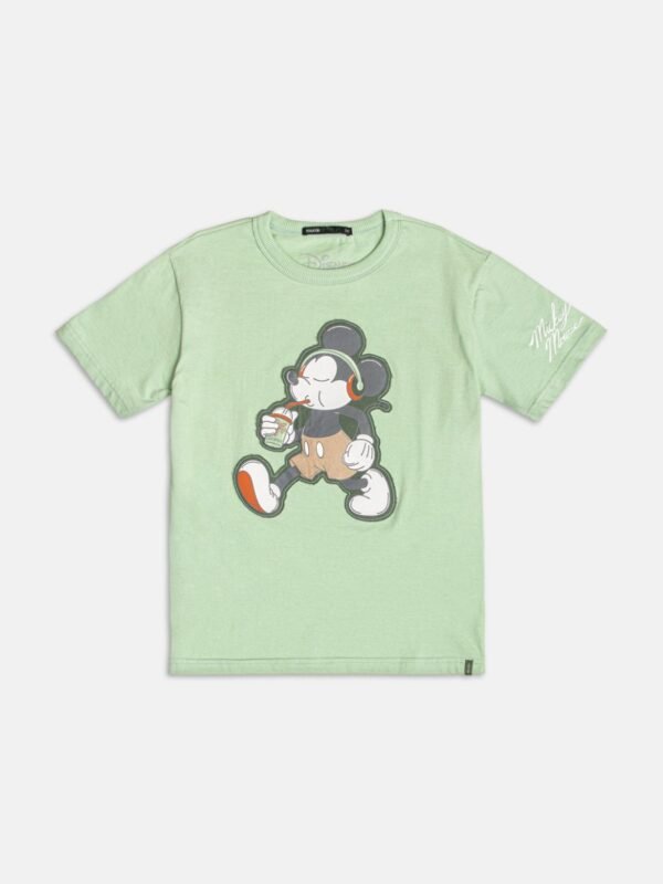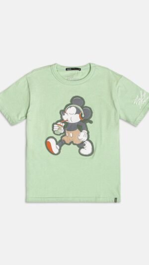 Camiseta infantil em malha macia, cor verde, com estampa divertida do Mickey ouvindo música e tomando milk-shake.