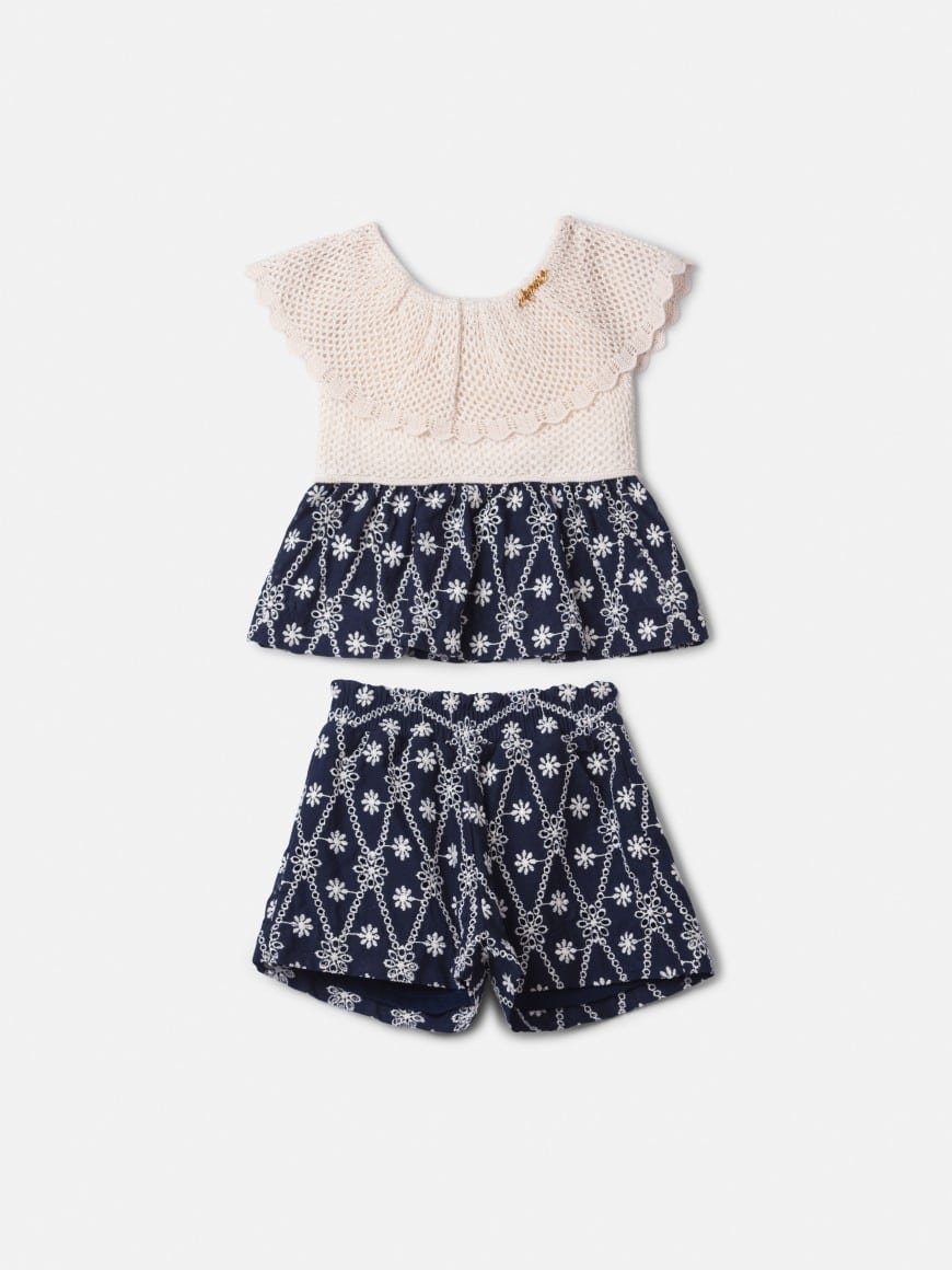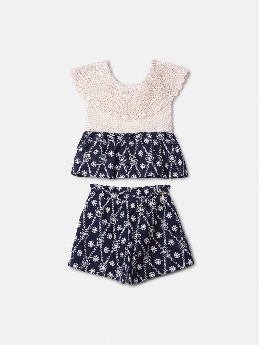 O short e a barra do top vêm em laise bordada azul marinho, trazendo textura, leveza e um visual encantador.