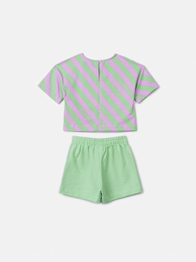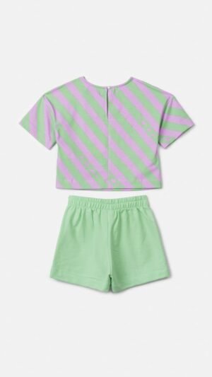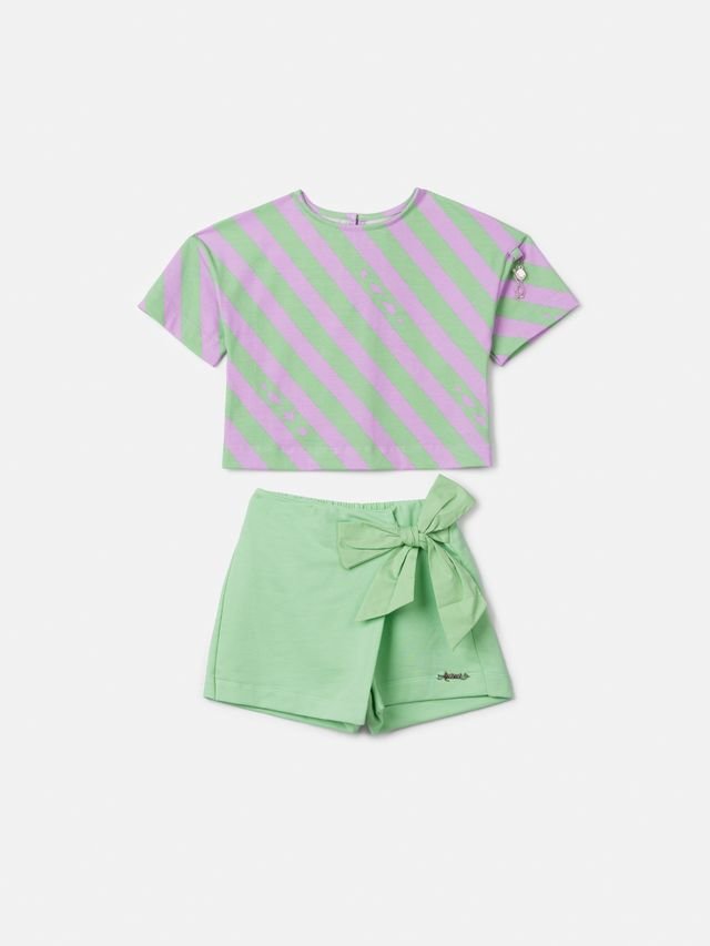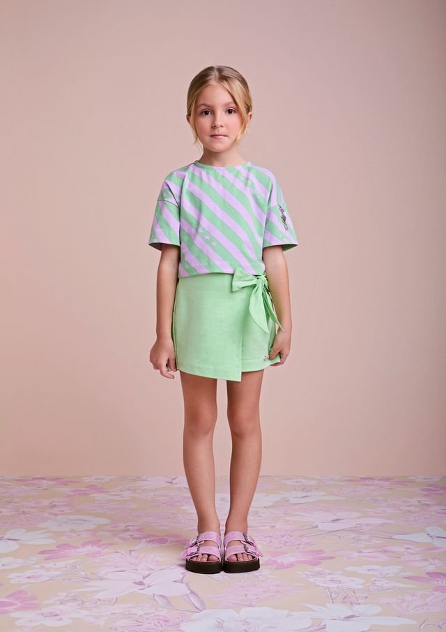 O conjunto candy color traz uma blusa listrada em verde e lilás com modelagem soltinha e mangas amplas, combinando perfeitamente com o short saia verde com laço lateral, um charme à parte.