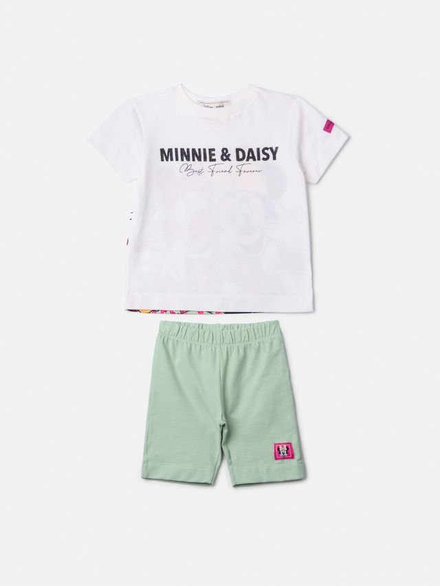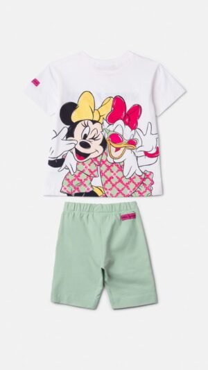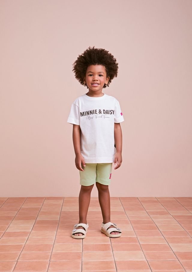 Esse conjunto é puro encanto, com camiseta off white e estampa frontal divertida da Minnie e Daisy com detalhes fashionistas e toque vibrante.