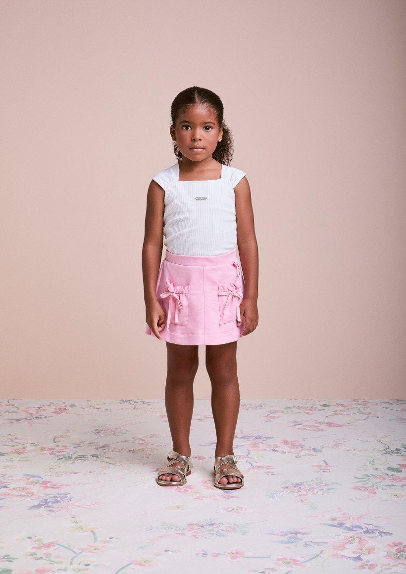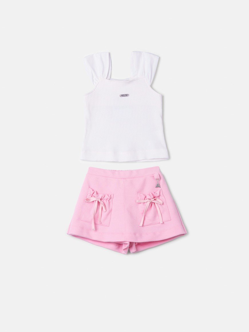 ??Um charme do início ao fim! Conjunto Animê com blusa canelada branca e saia rosa com bolsos e laços delicados.