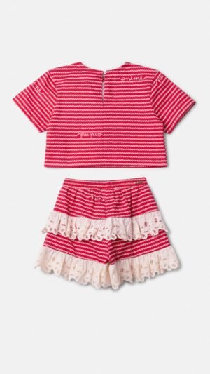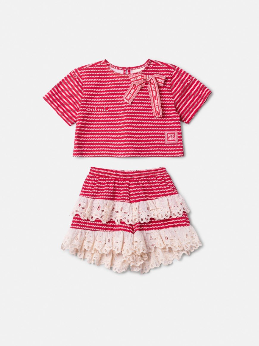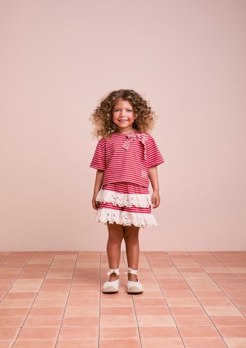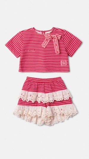 Conjunto infantil Animê em malha de algodão com elastano, blusa listrada vermelha com laço no ombro e saia com detalhes em laise.