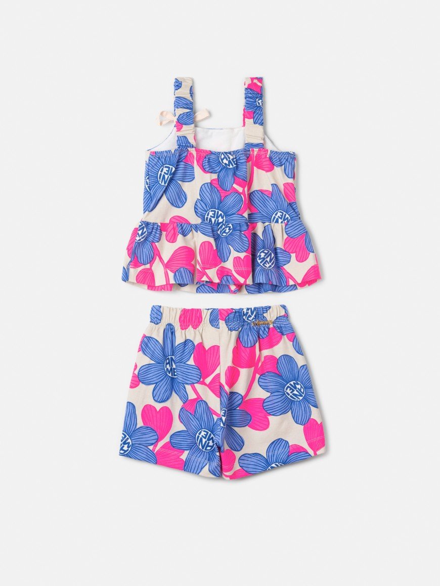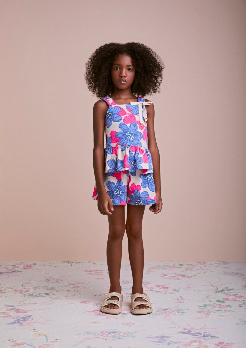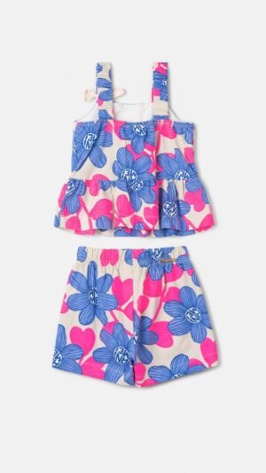 Regata com detalhe em laço e babado, acompanhada de short soltinho, ambos com estampa floral em cores vibrantes.
