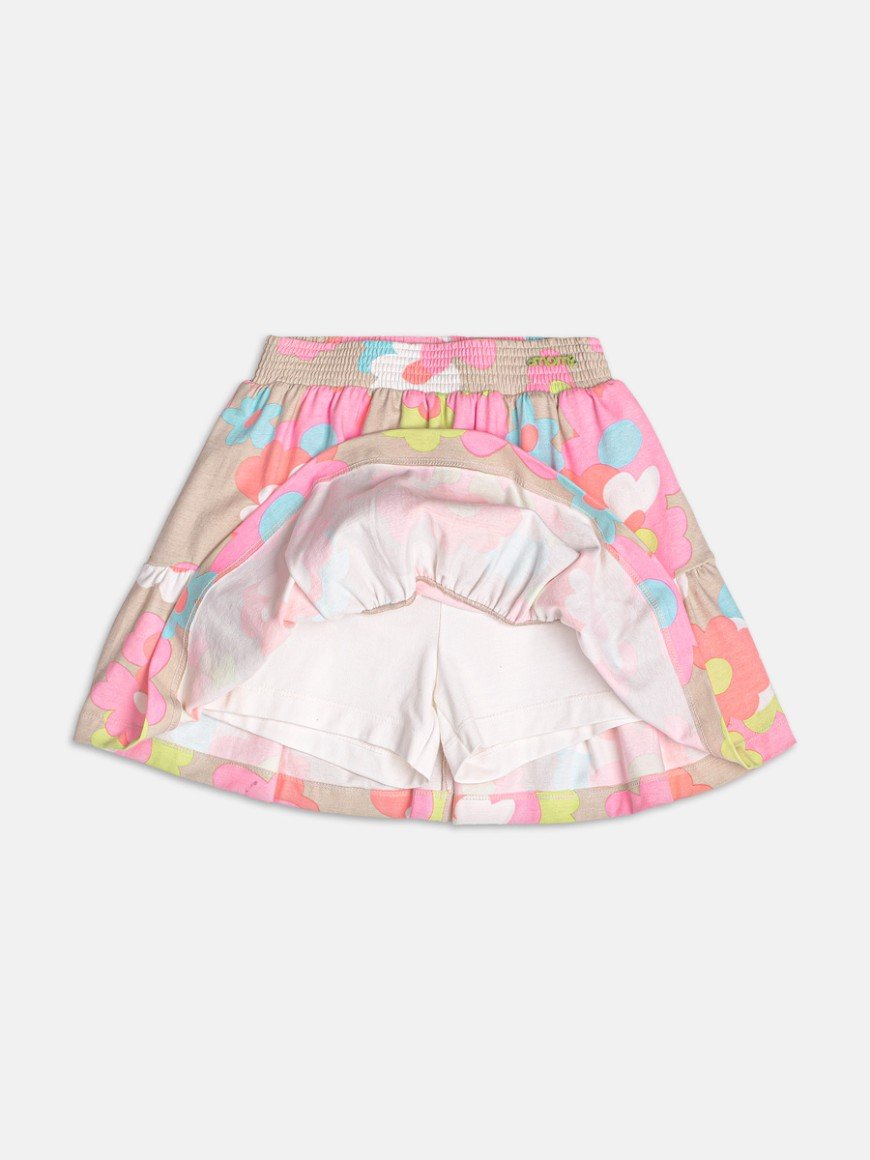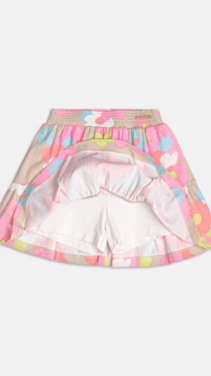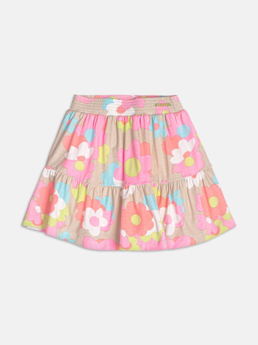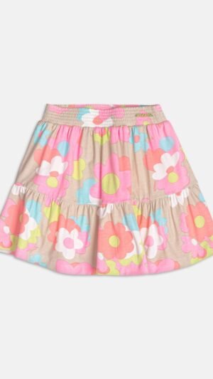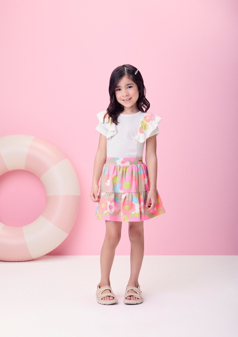 A saia estampada em flores coloridas possui shorts embutido por baixo, garantindo liberdade nos movimentos e conforto para brincar à vontade. Um look leve, prático e perfeito para acompanhar as pequenas em momentos especiais e no dia a dia com muito estilo.