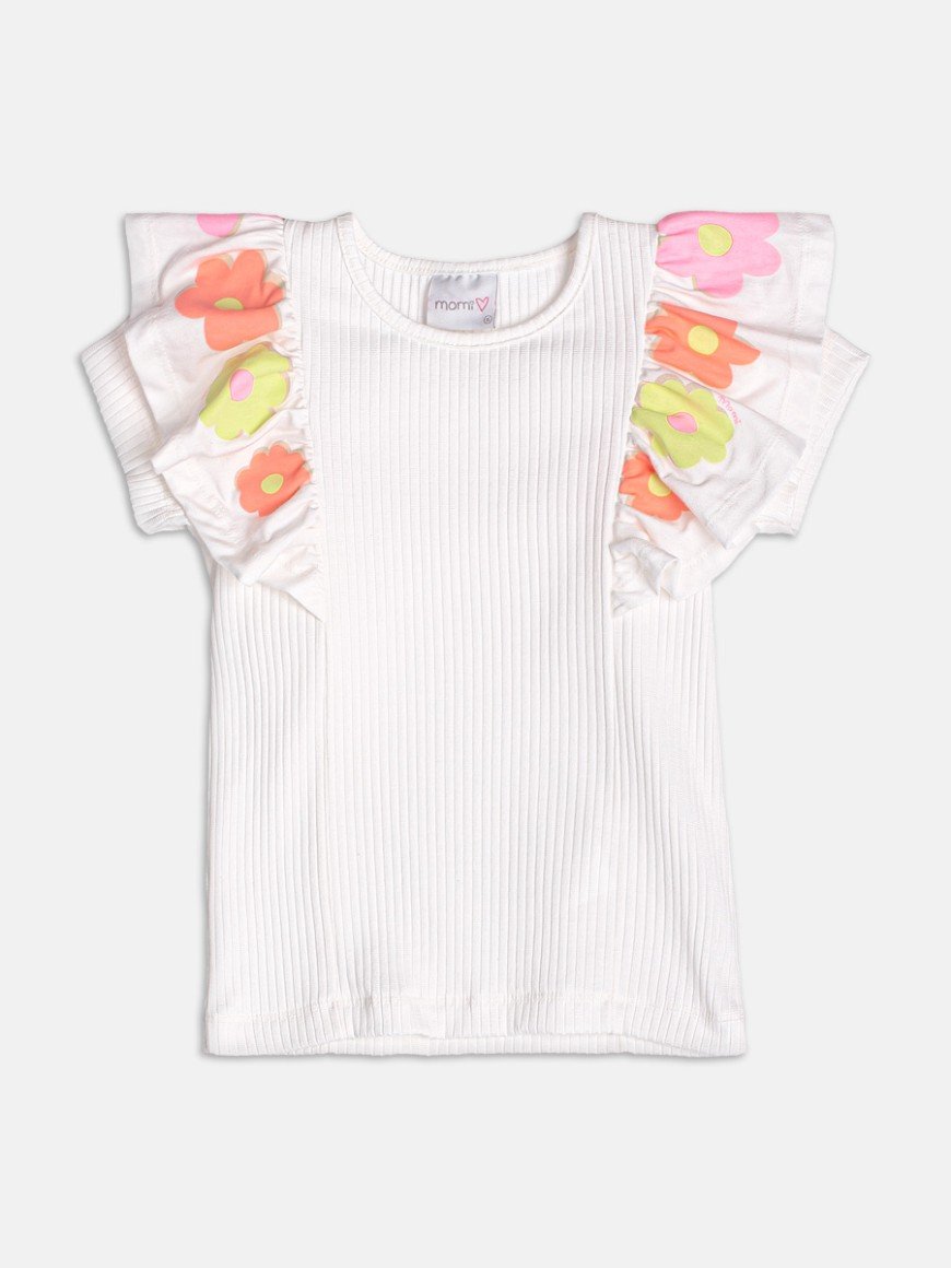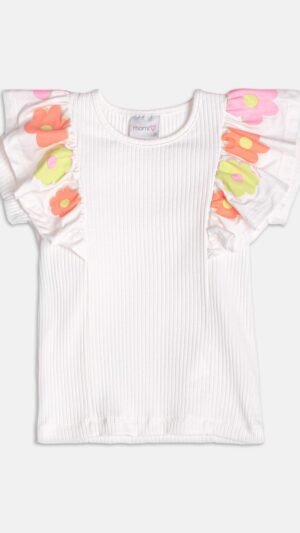 A blusa em malha canelada macia tem detalhes em babados florais nos ombros, trazendo um toque alegre e divertido ao visual.