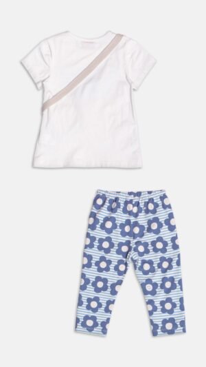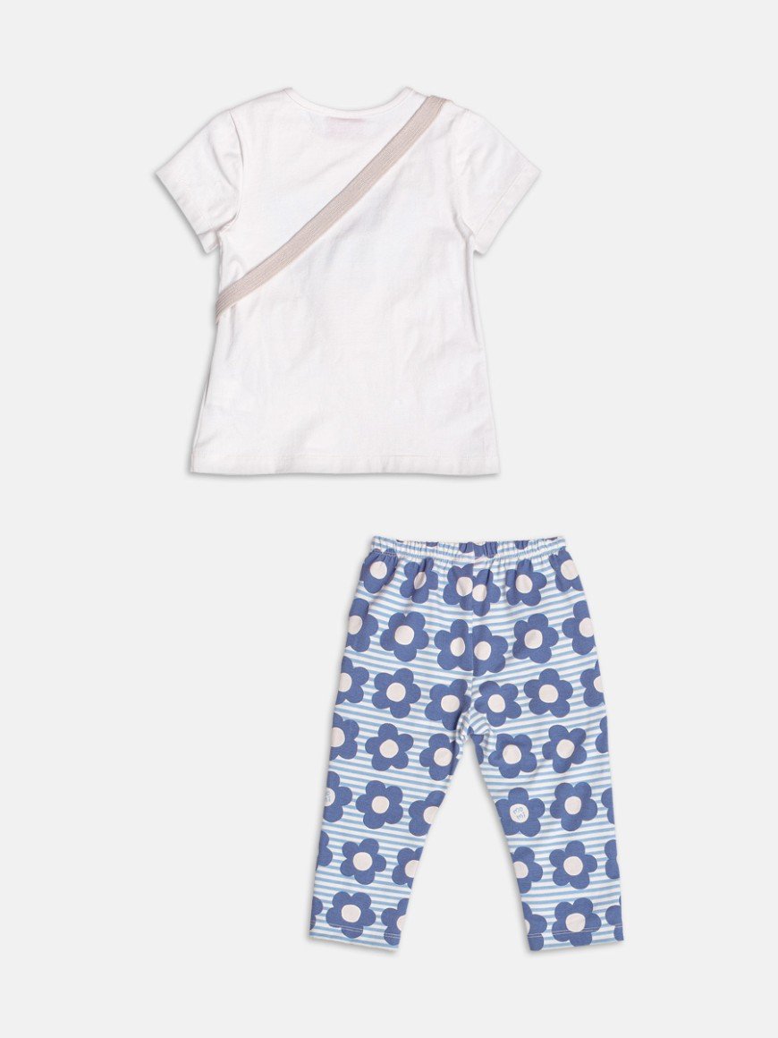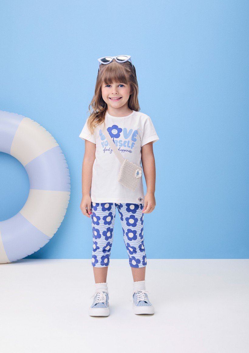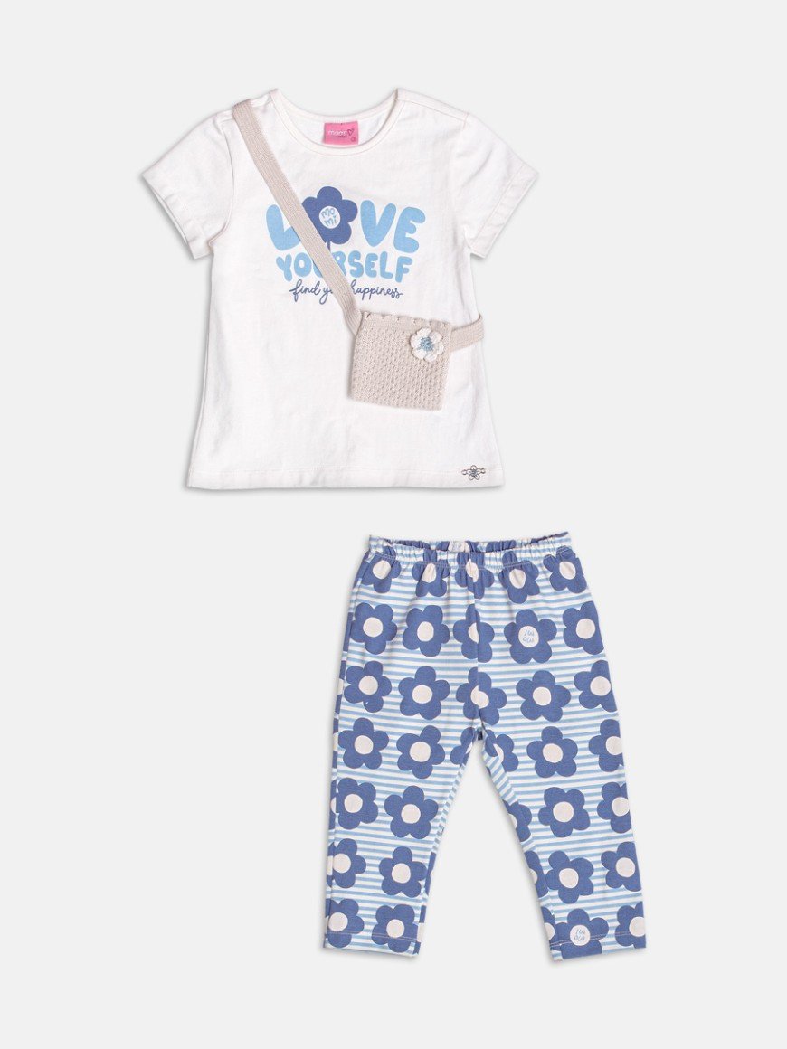 Camiseta branca com estampa azul e bolsinha em tricô aplicada, acompanhada de calça capri estampada com flores.