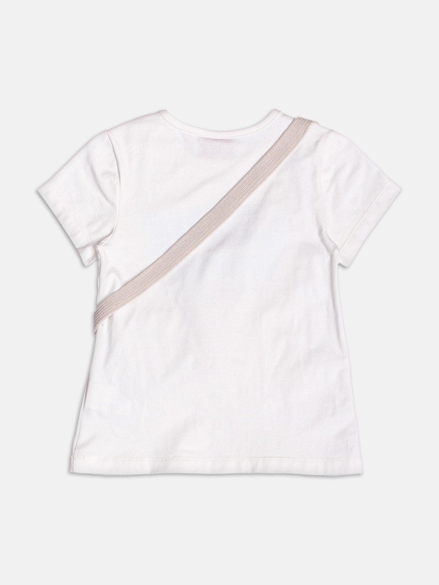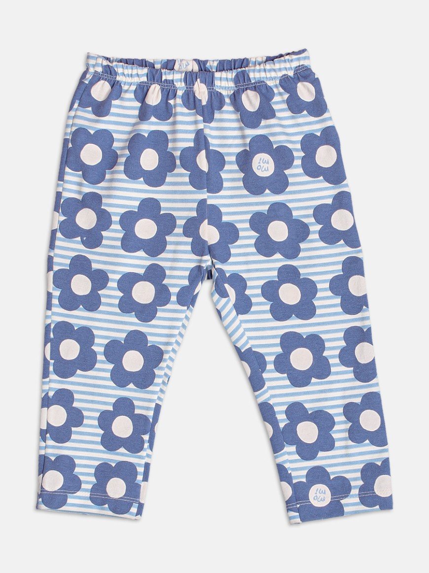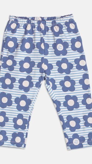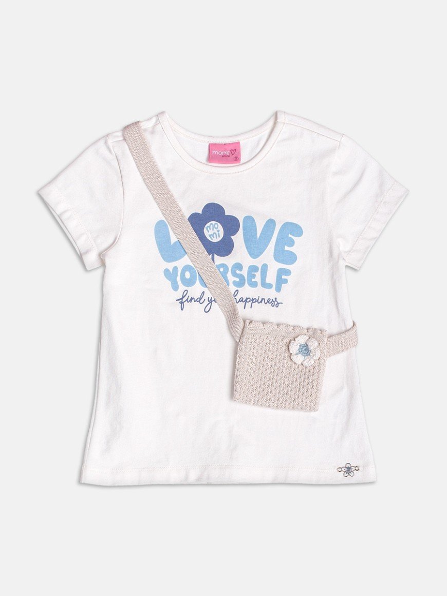 Camiseta branca com estampa azul e bolsinha em tricô aplicada, acompanhada de calça capri estampada com flores.