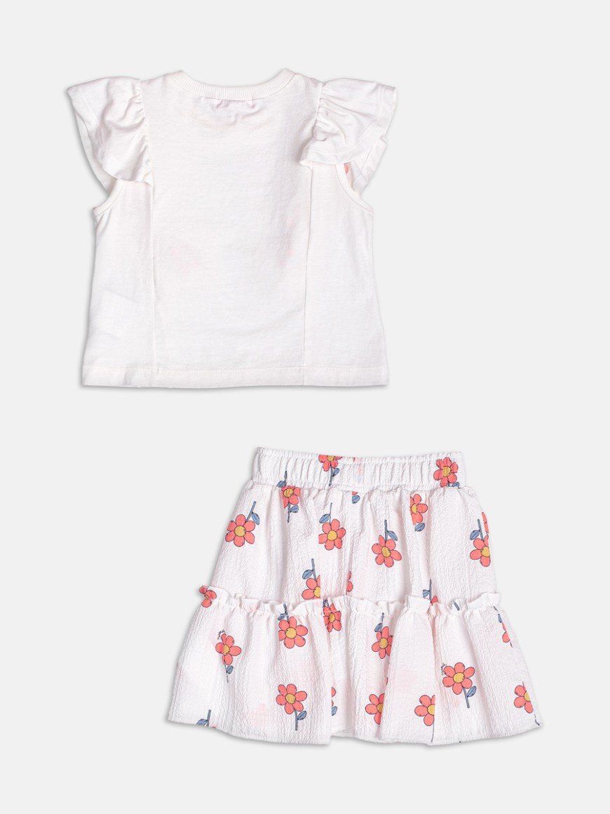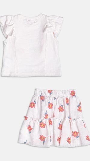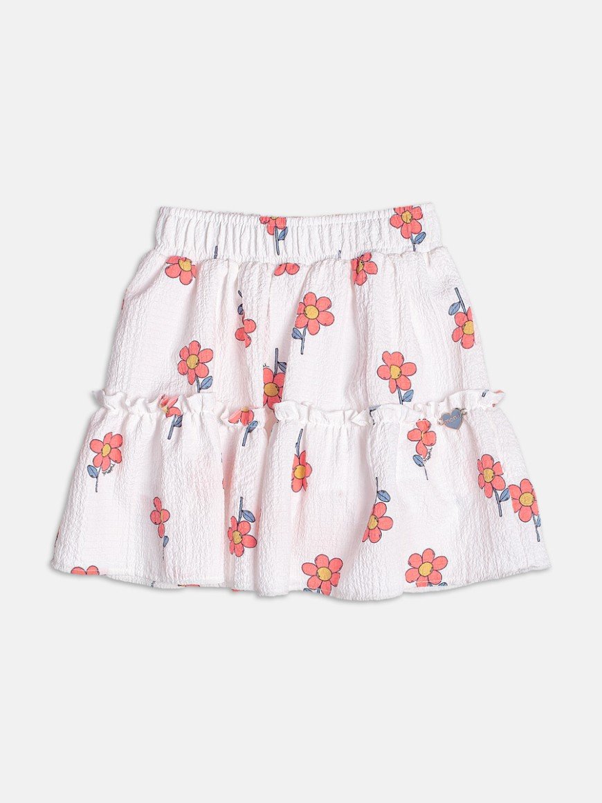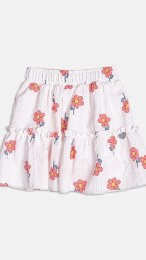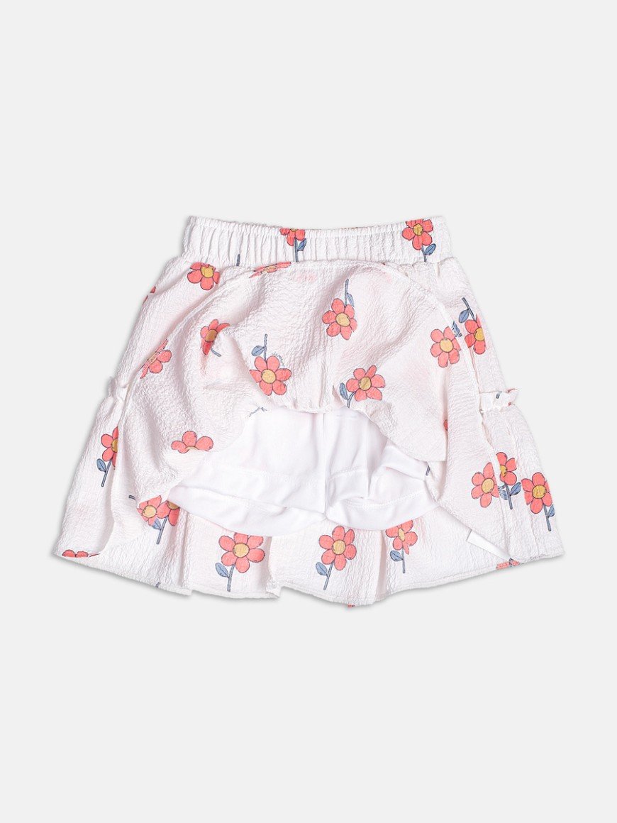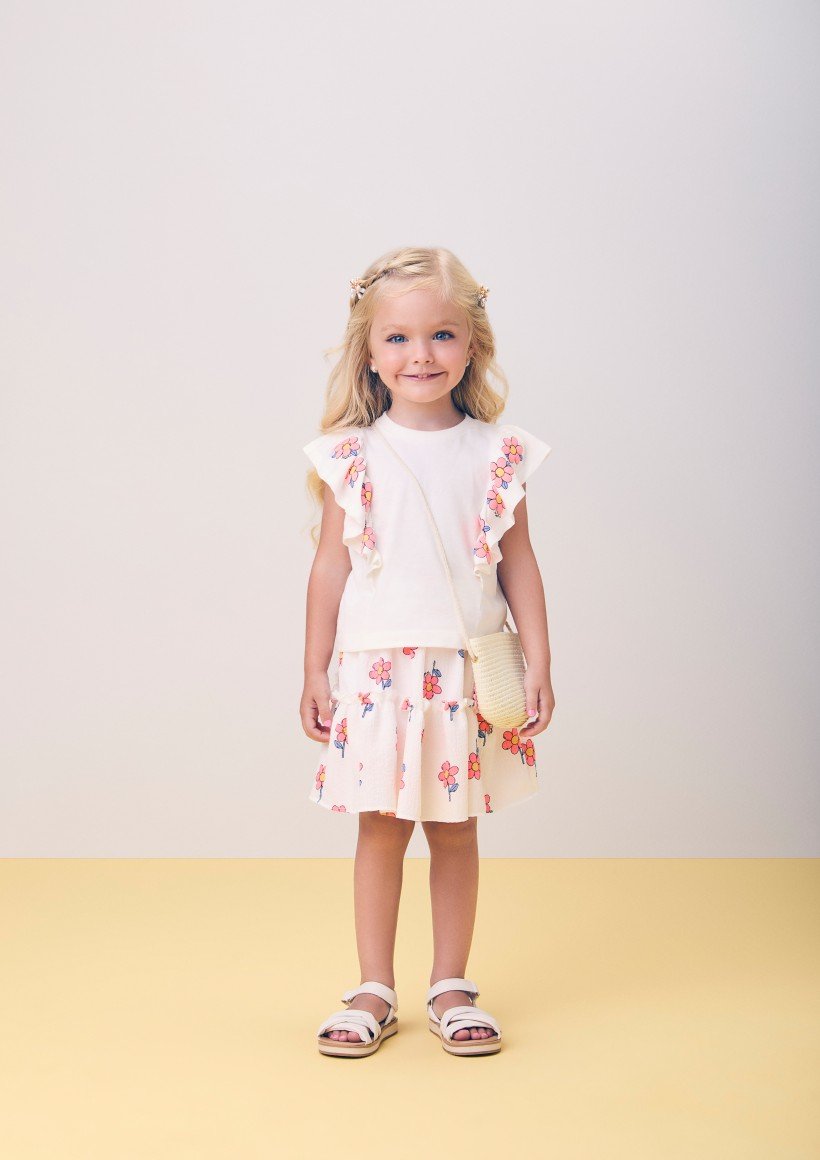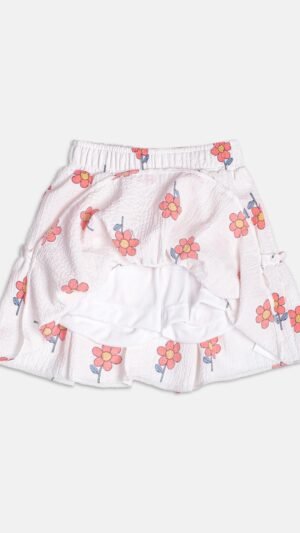 A saia em tecido anarrugado tem caimento leve e fluido, estampa delicada de flores e shorts embutido por baixo, garantindo liberdade de movimentos e conforto extra para brincar, passear e se divertir com estilo.