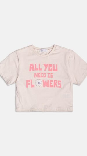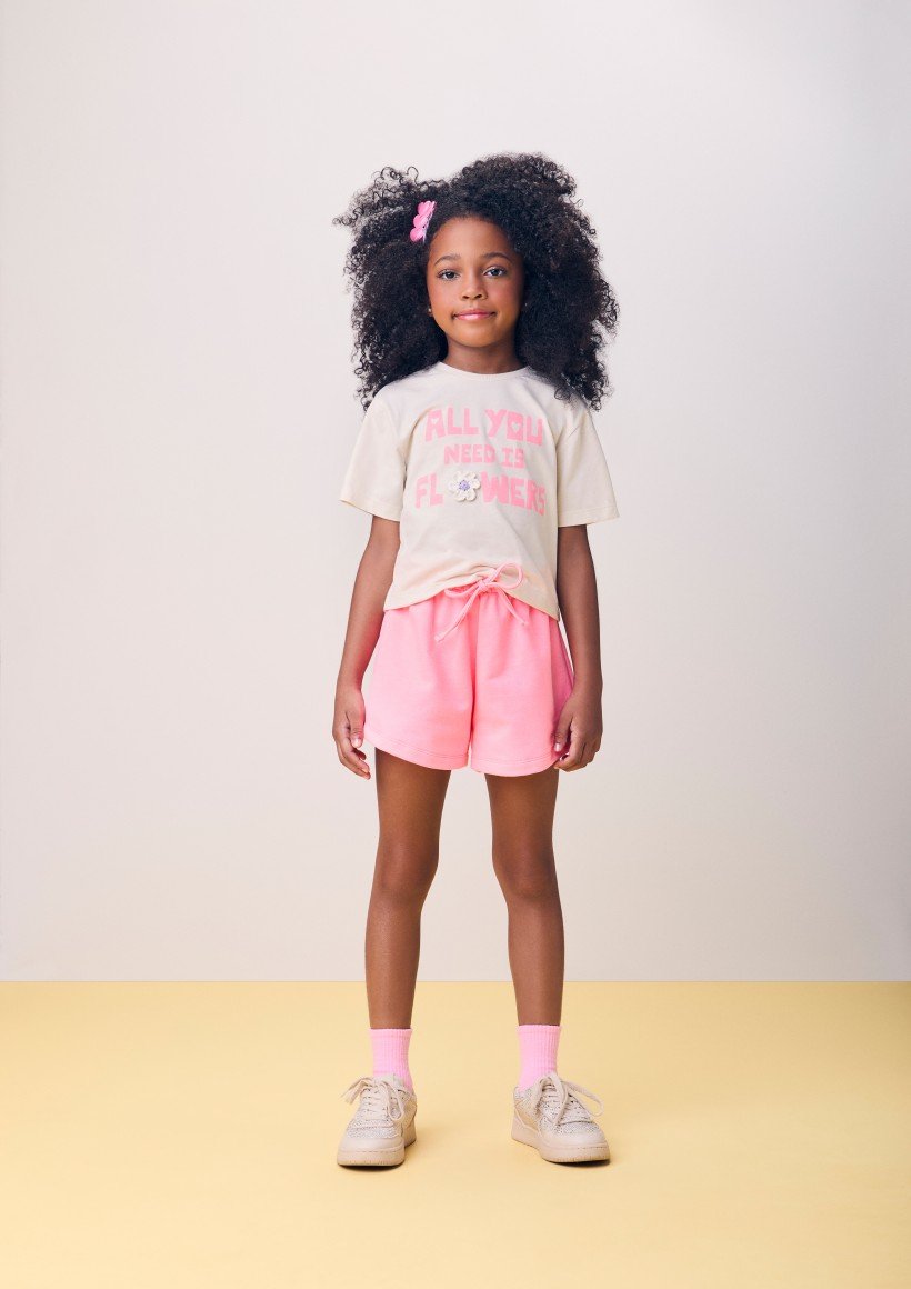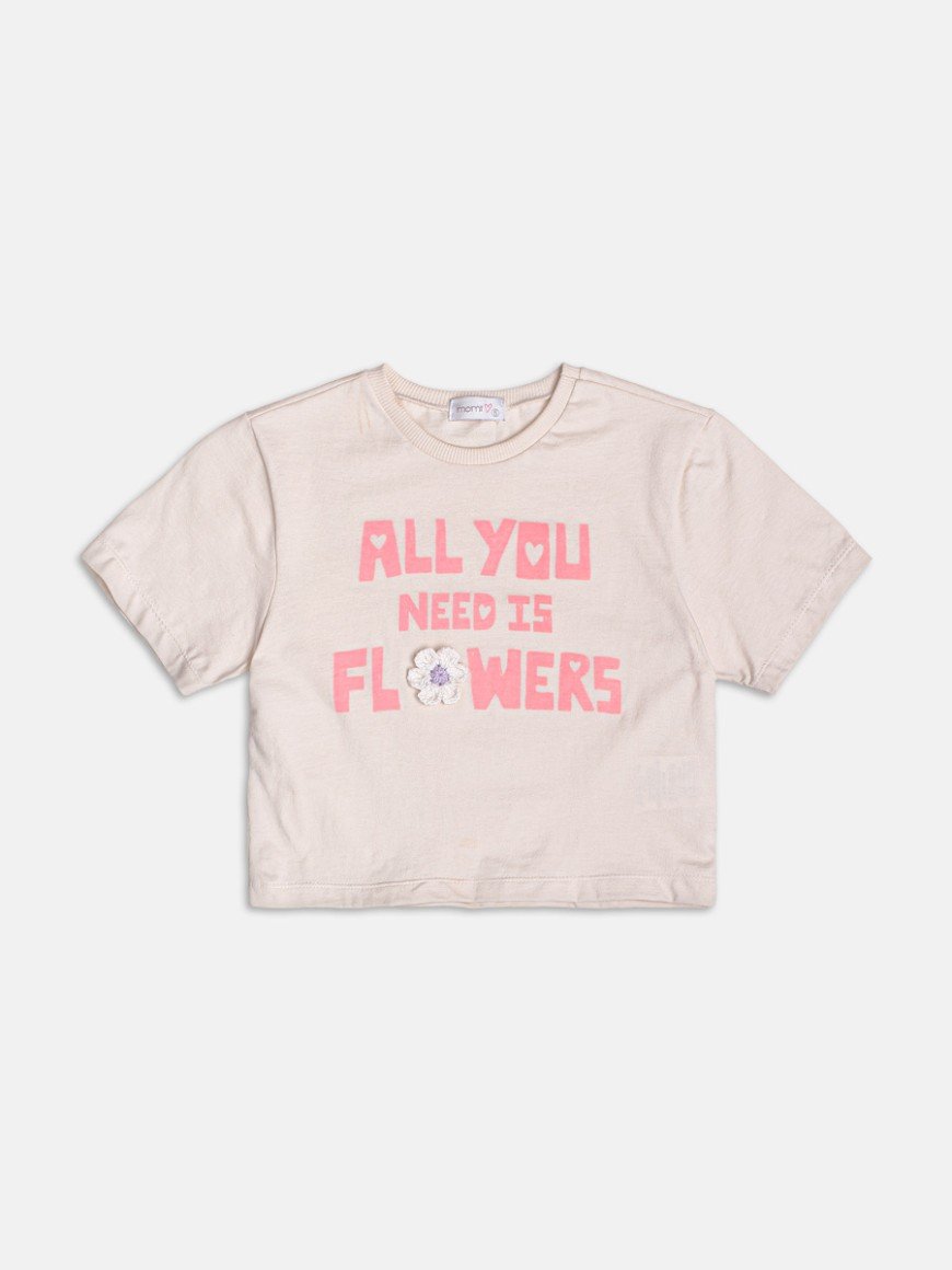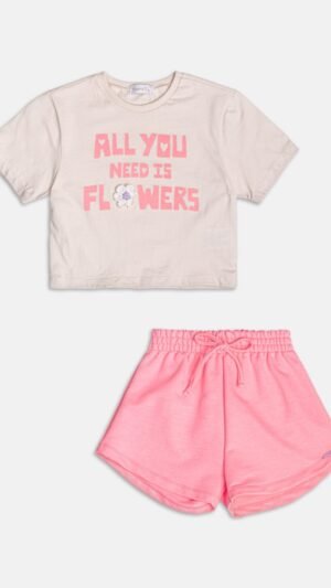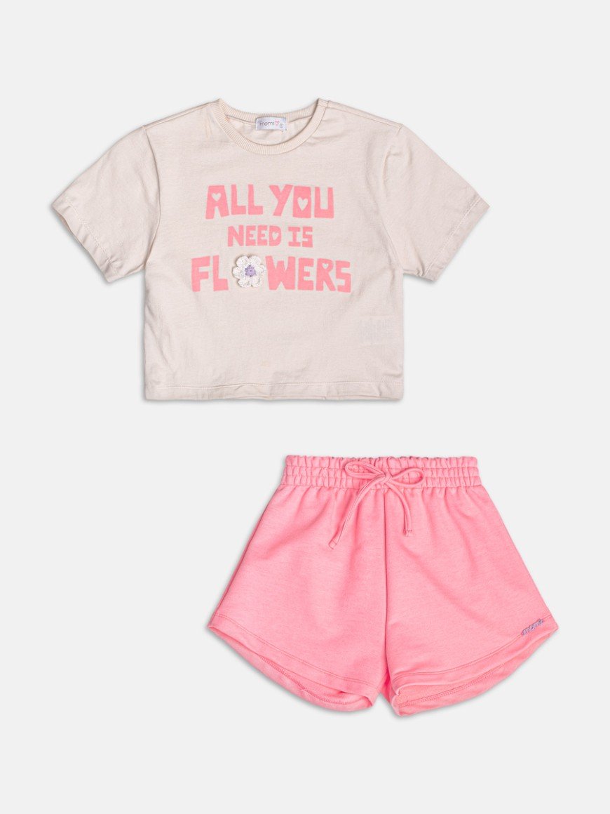 Esse conjunto da Momi é composto por blusa off white com estampa em lettering All You Need is Flowers em rosa, detalhe de flor aplicada e amarração frontal, que traz um toque fashion à peça.