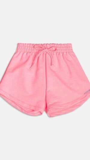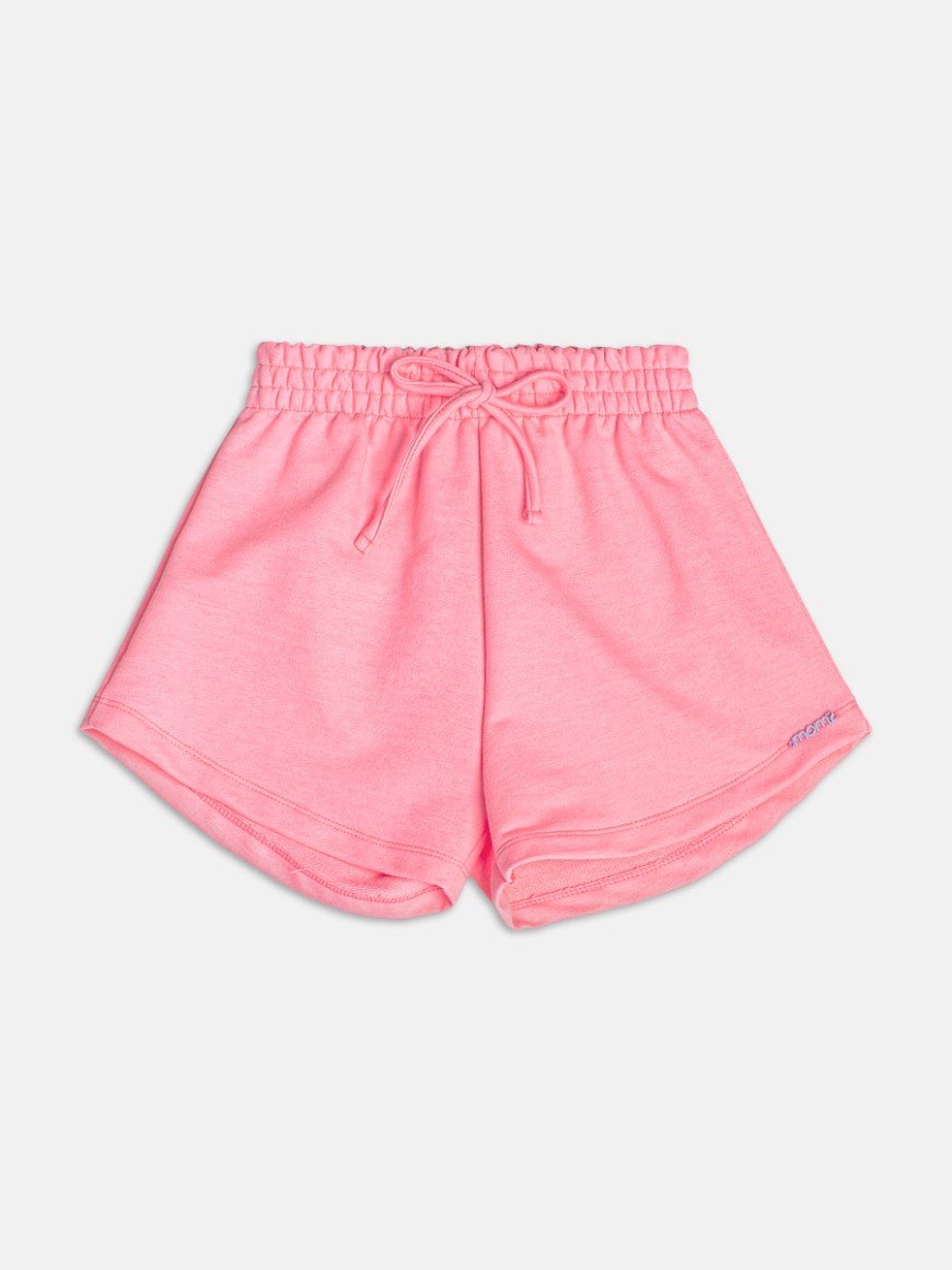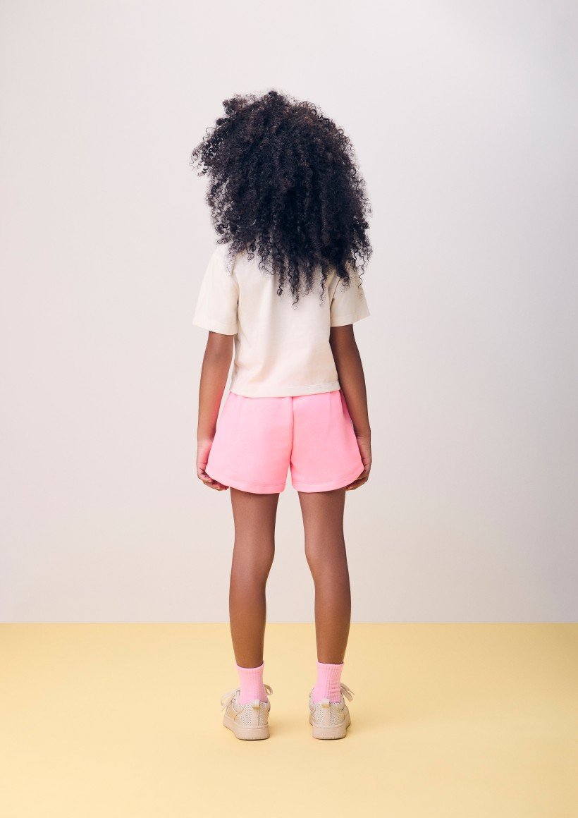 Acompanha shorts rosa neon com cós elástico e amarração, proporcionando praticidade e muito conforto para as pequenas brincarem e se divertirem o dia todo.