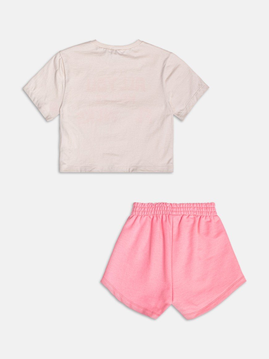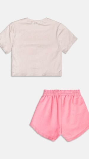 Cores: Blusa off white com detalhes rosa / Shorts rosa neon