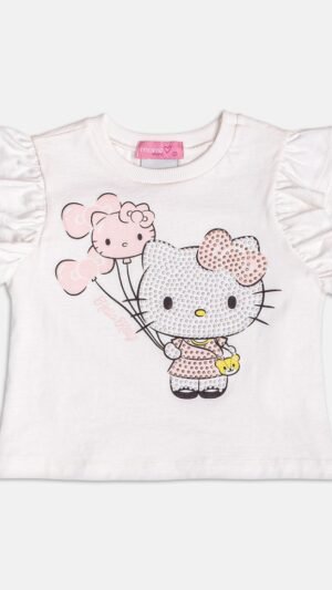 Esse conjunto da Momi é composto por blusa off white com mangas de babadinho e estampa da personagem Hello Kitty com detalhes brilhantes, trazendo ainda mais charme à peça.