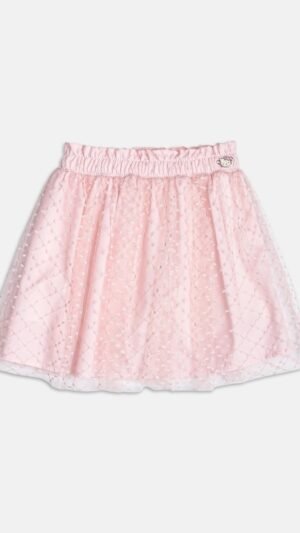 Acompanhando, saia rosa com sobreposição de tule poá, que garante leveza, movimento e um toque romântico ao visual.