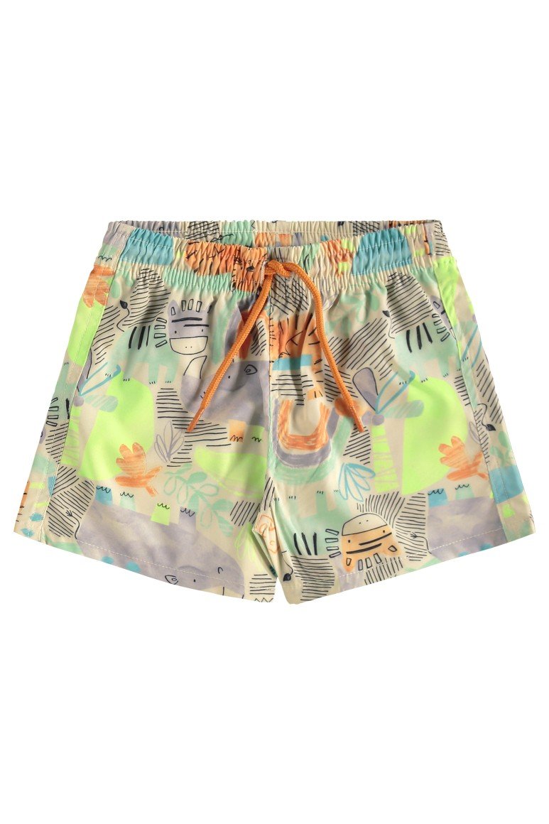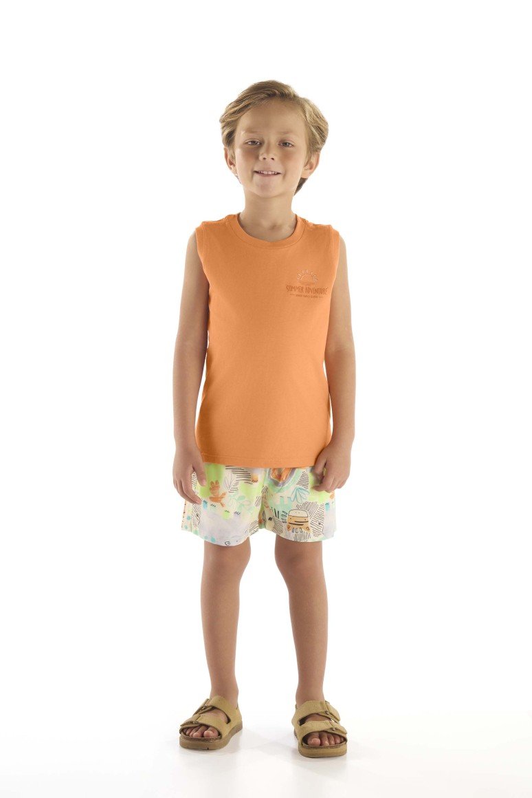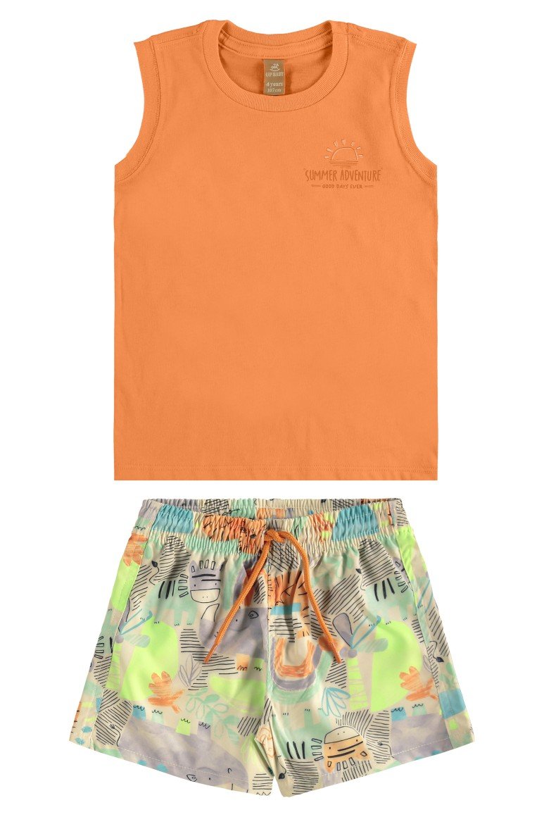 A regata em malha leve garante liberdade para brincar à vontade, enquanto a bermuda em microfibra com estampa divertida traz um toque lúdico e alegre ao visual.