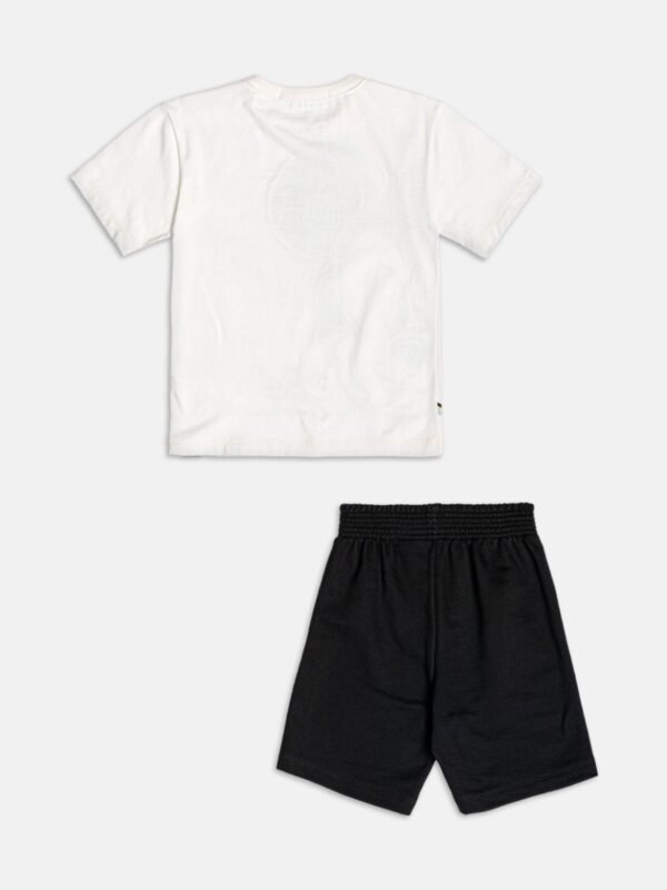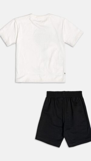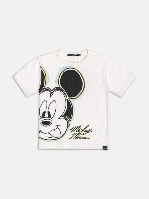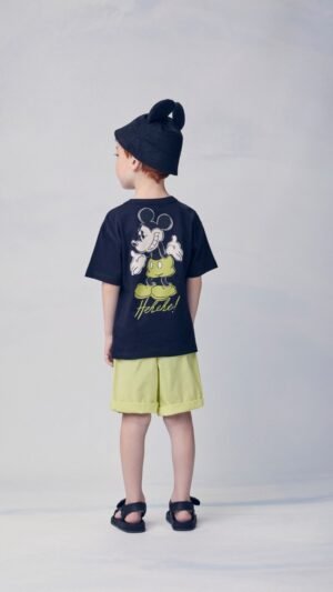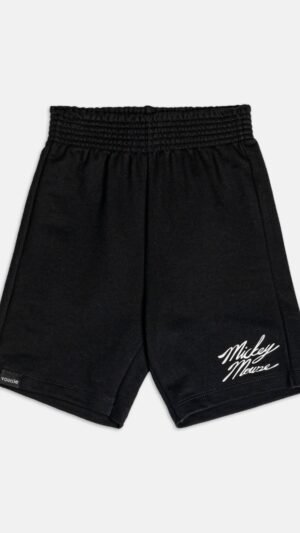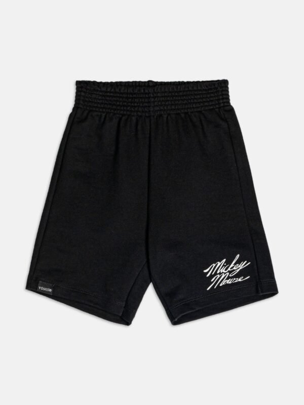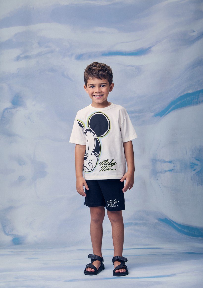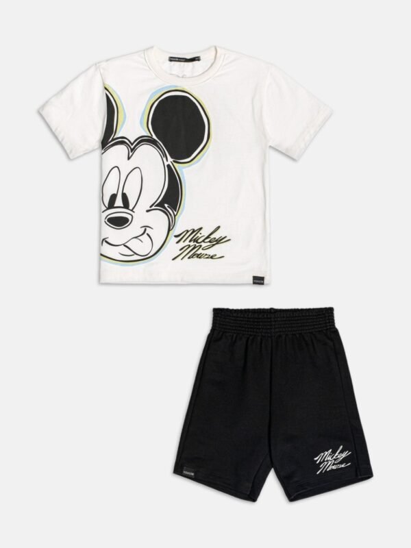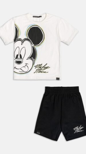 Camiseta branca com estampa frontal grande do Mickey e bermuda preta em moletinho macio, com detalhe do nome do personagem.