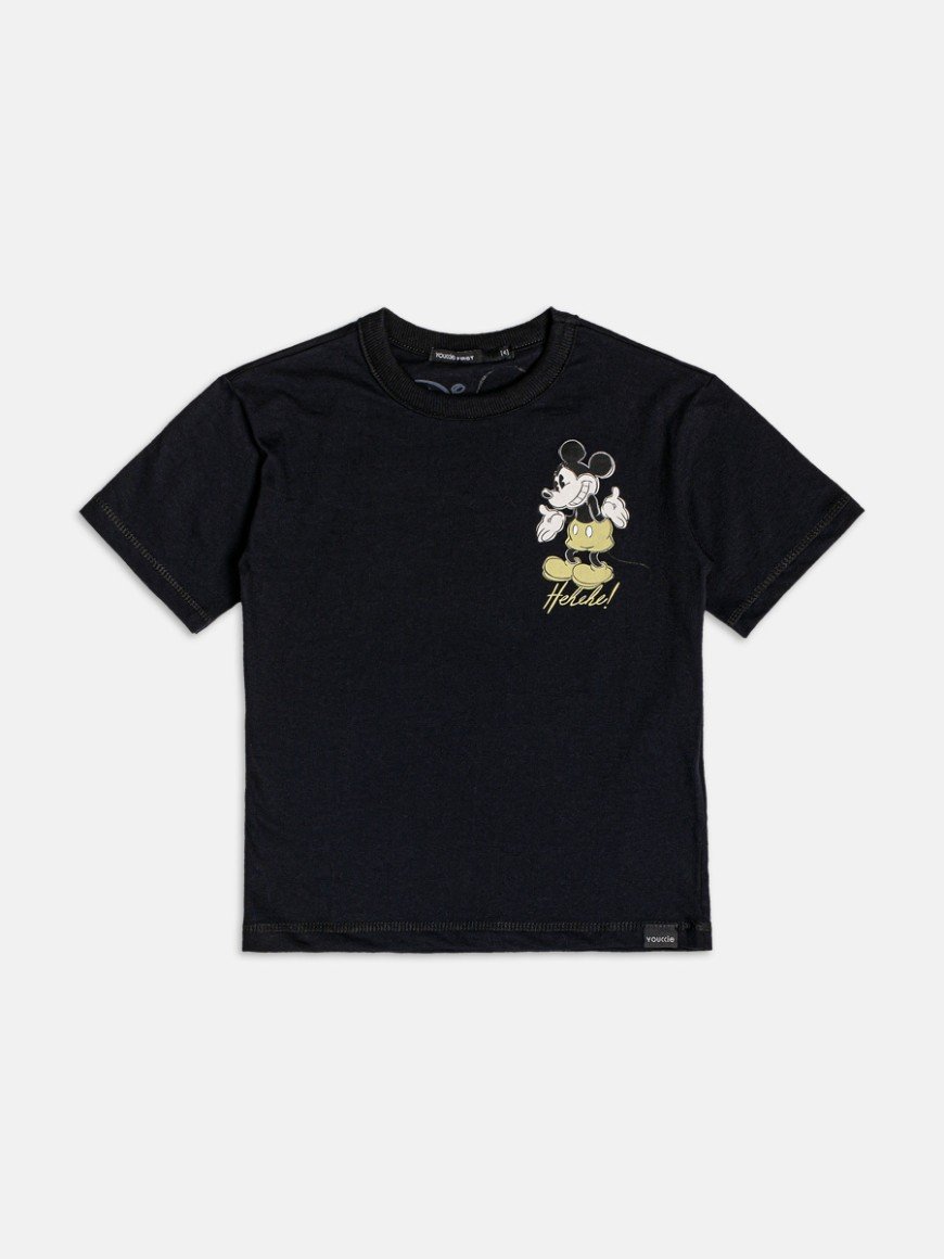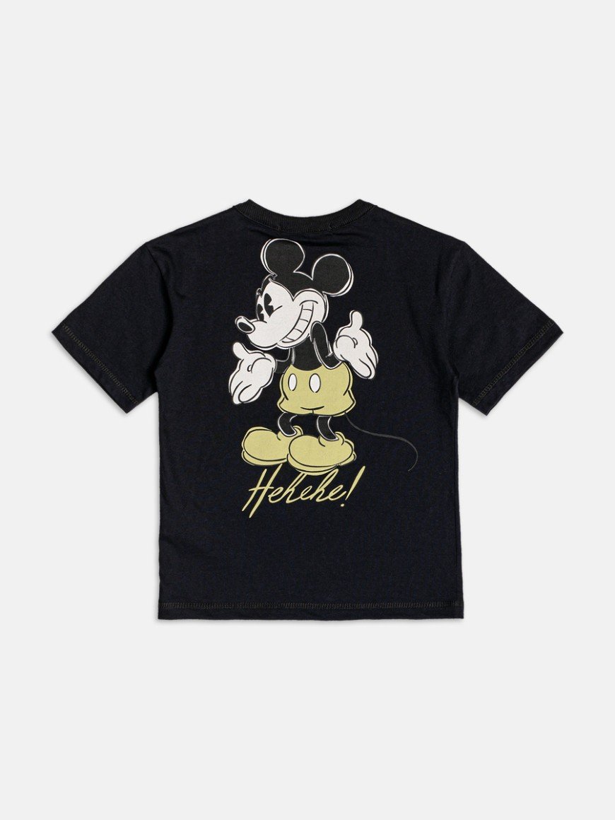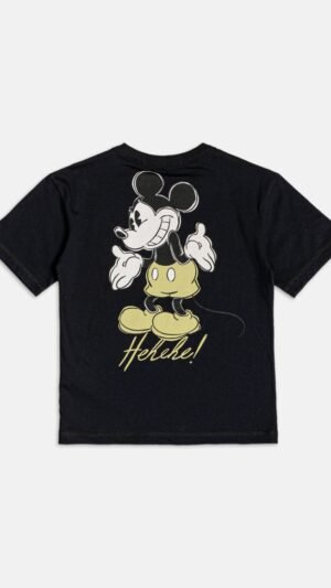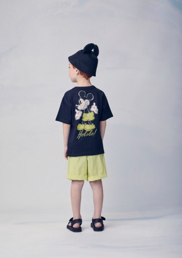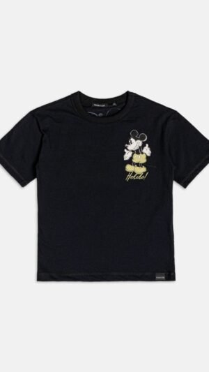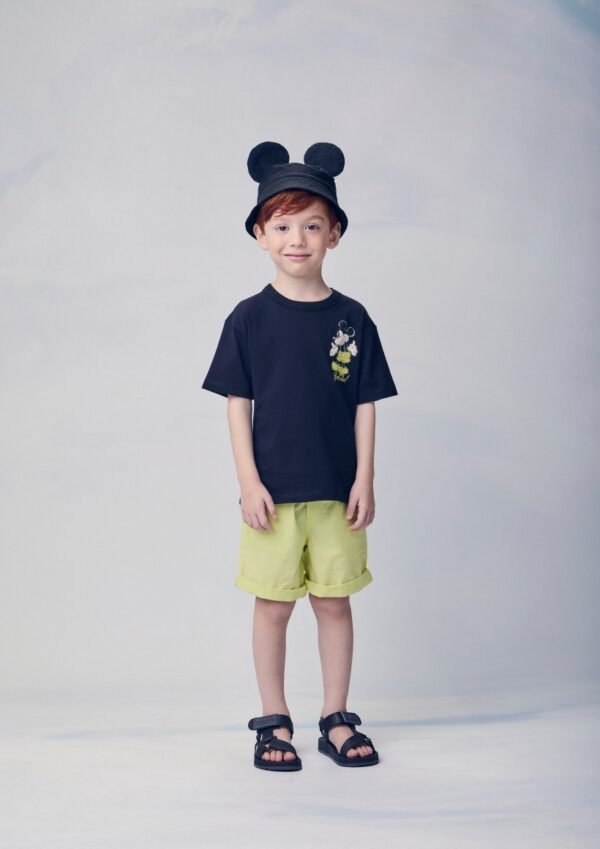 Camiseta preta com estampa divertida do Mickey e bermuda amarela em tecido leve, garantindo conforto e um visual moderno.