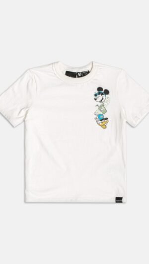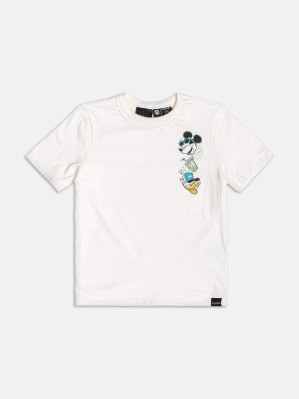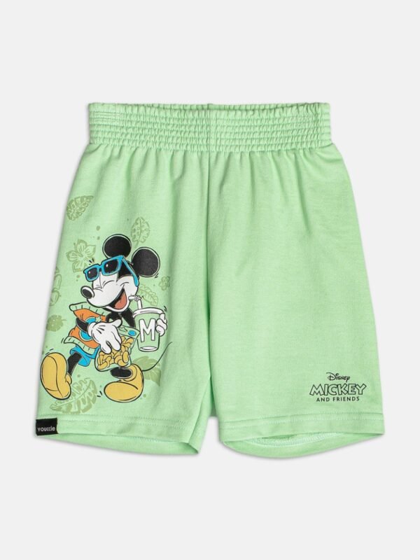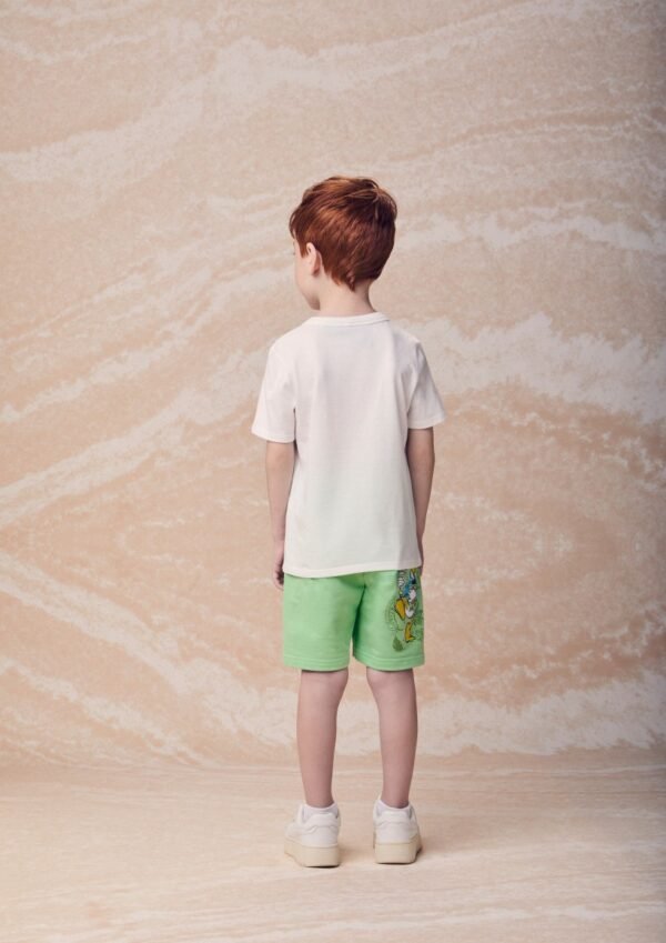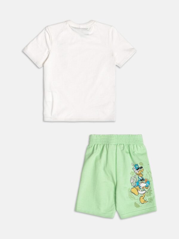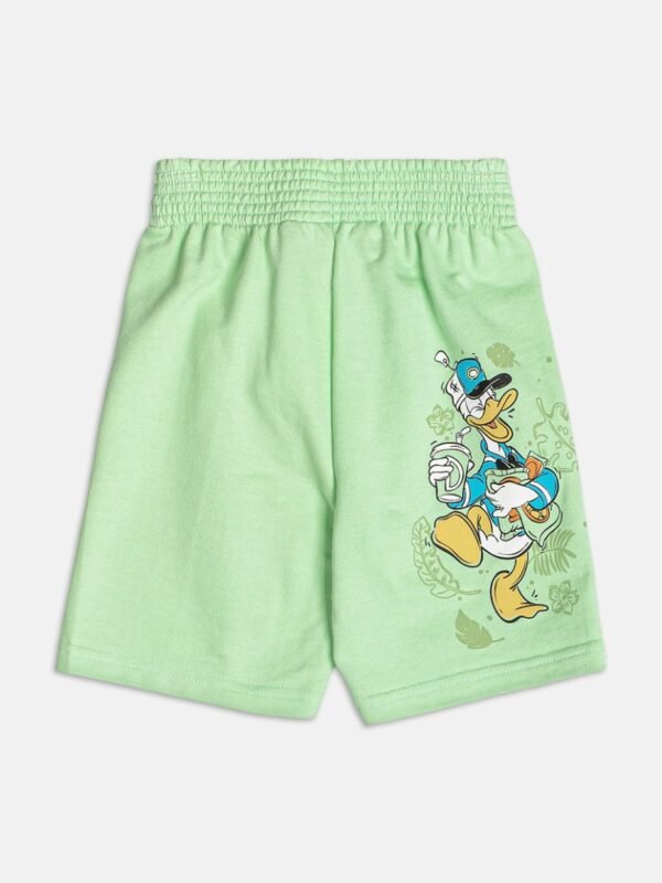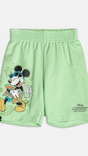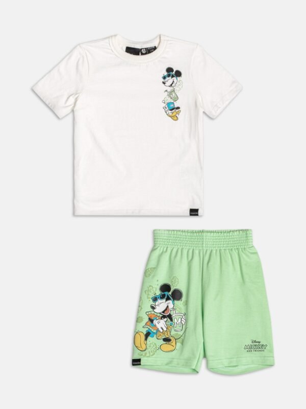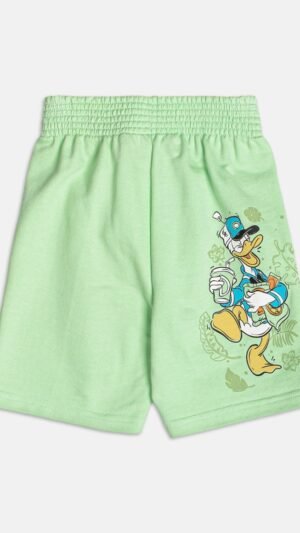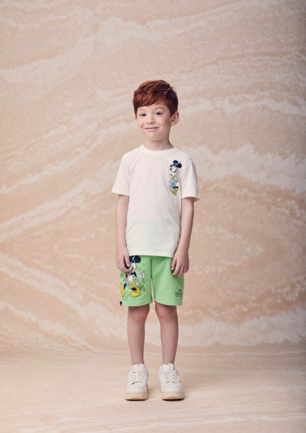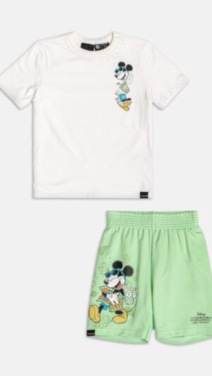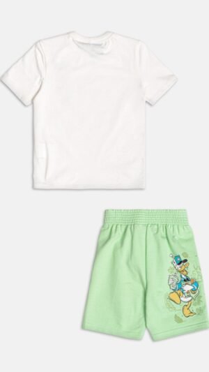 Camiseta branca com estampa dos personagens Disney e bermuda verde em moletinho com estampa exclusiva do Mickey e Donald.