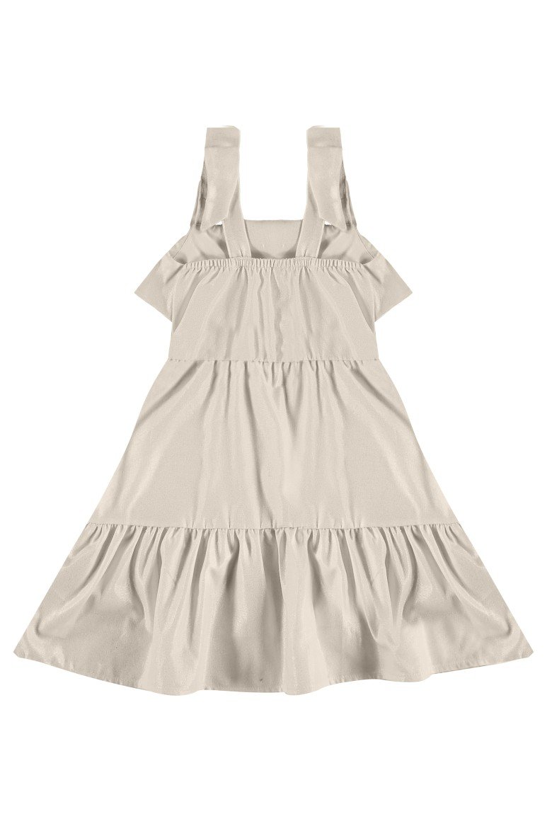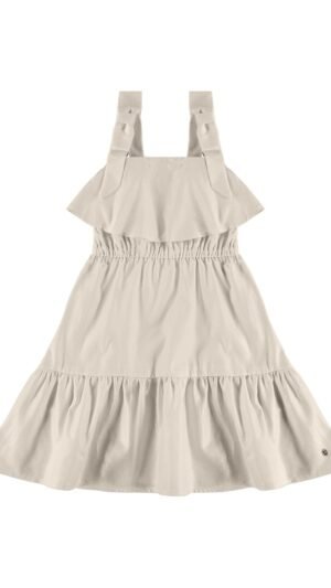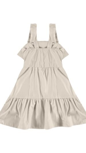Possui alças largas com detalhe em laço, babado na parte superior e saia em camadas, trazendo movimento e delicadeza.